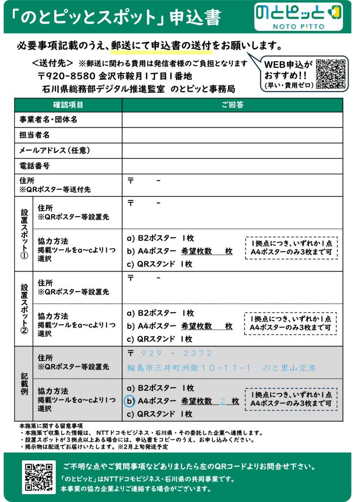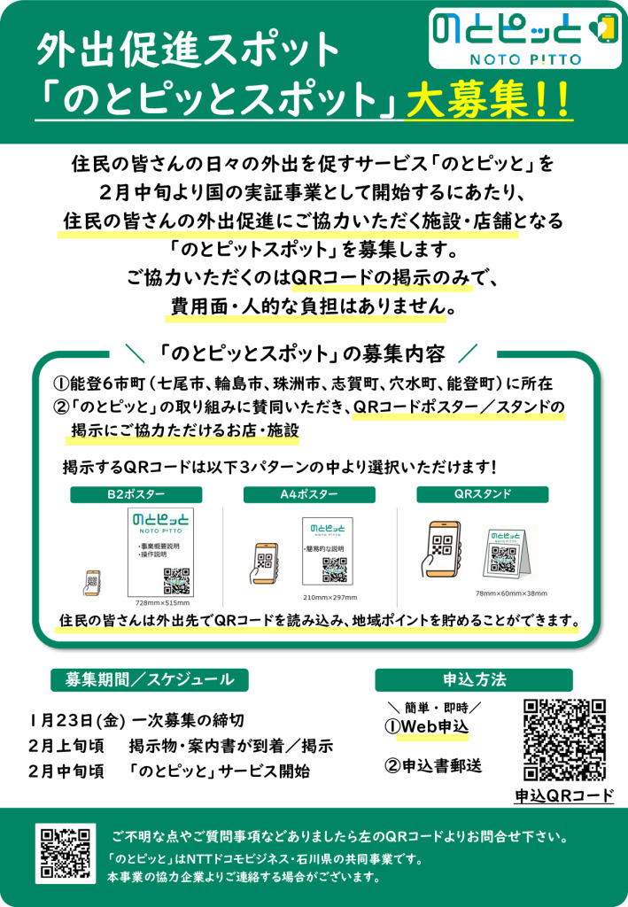 発災後、大きな環境変化のあった能登6市町にお住まいの住民の皆様の健康増進につなげるため、石川県とNTTドコモビジネス㈱が連携し、国の実証事業として、施設等に設置された専用のQRコードをスマホで読み取ること等により、地域ポイントを付与するサービス「のとピッと」が2月中旬頃より開始されます。