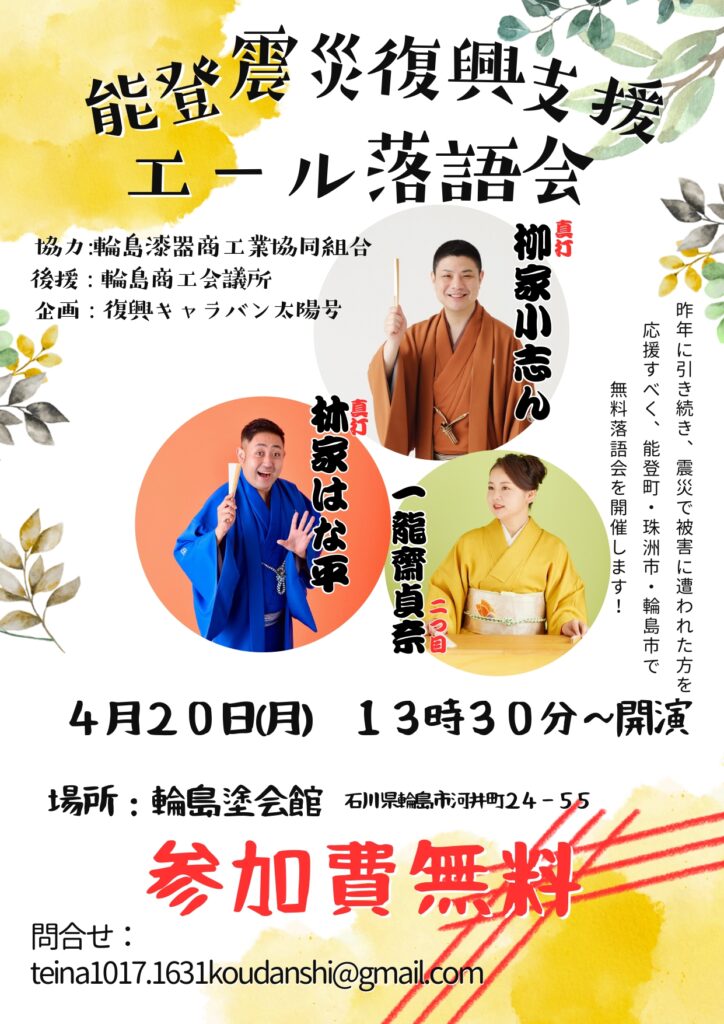 「能登震災復興支援エール落語会」開催のご案内 2026年03月26日トピックス, 新着 令和8年4月20日(月)に輪島塗会館において、「能登震災復興支援エール落語会」が開催されます! 参加無料ですのでお誘いあわせのうえ、ぜひ足をお運びください。