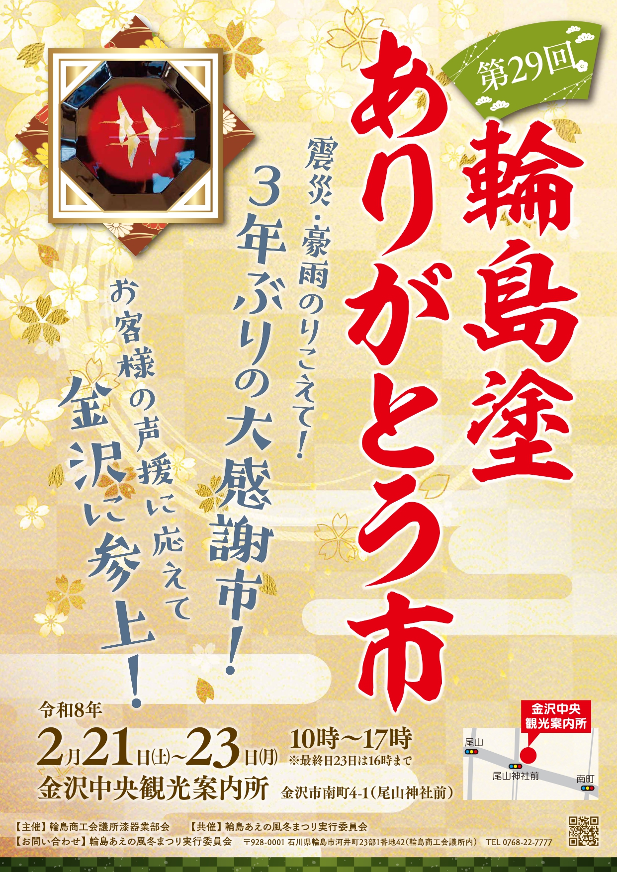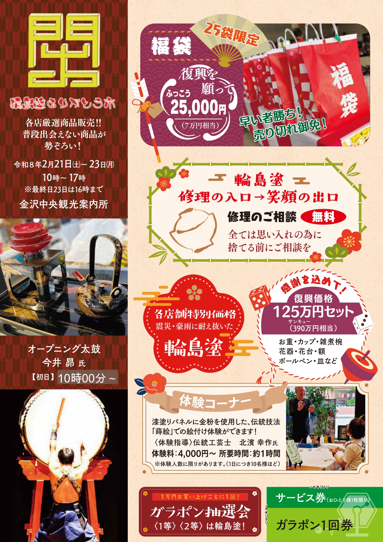 日頃からの輪島塗へのご愛顧に対する、年に一度の感謝市!震災・豪雨をのりこえて、3年ぶりに開催します。蒔絵職人による実演・体験コーナーや、特別価格での輪島塗の展示販売に加え、輪島塗「復興」福袋、復興価格125万円(いいふっこう)セット、ガラポン抽選会など特別企画を多数ご用意いたします。職人技の結晶である輪島塗に是非触れてみてください。