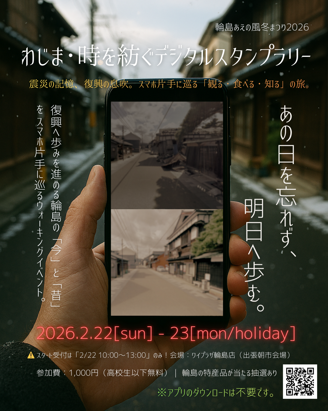 震災から2年。復興へと歩みを進める輪島の街を舞台に、スマートフォンを使ったデジタルスタンプラリーを開催します。 テーマは「観る」「食べる」「知る」。 震災前の懐かしい風景と現在の街並みを重ね合わせたり、再開した飲食店で舌鼓を打ったり。 輪島の「今」を肌で感じるウォーキングに、ぜひご参加ください