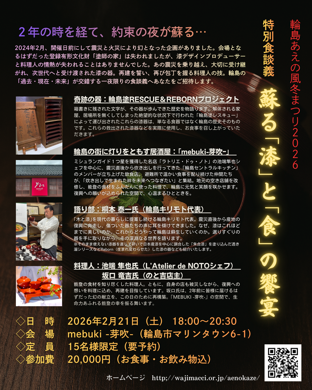 2024年2月、開催日前にして震災と火災により幻となった企画がありました。会場となるはずだった登録有形文化財「塗師の家」は失われましたが、漆デザインプロデューサーと料理人の情熱が失われることはありませんでした。あの震災を乗り越え、大切に受け継がれ、次世代へと受け渡された漆の器。再建を誓い、再び包丁を握る料理人の技。輪島の「過去・現在・未来」が交錯する一夜限りの食談義へあなたをご招待します。