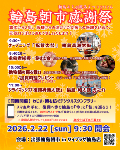 2月22日(日)は、出張朝市が開催されている「ヤスサキワイプラザ輪島店」にて、皆様への感謝を込めたお祭りを開催します。 朝市組合員の元気な掛け声とともに、勇壮な祝賀太鼓や、心温まる地物鍋の振る舞いなど、輪島の活気を肌で感じるプログラムをご用意しました。 共に輪島の朝を楽しみましょう。